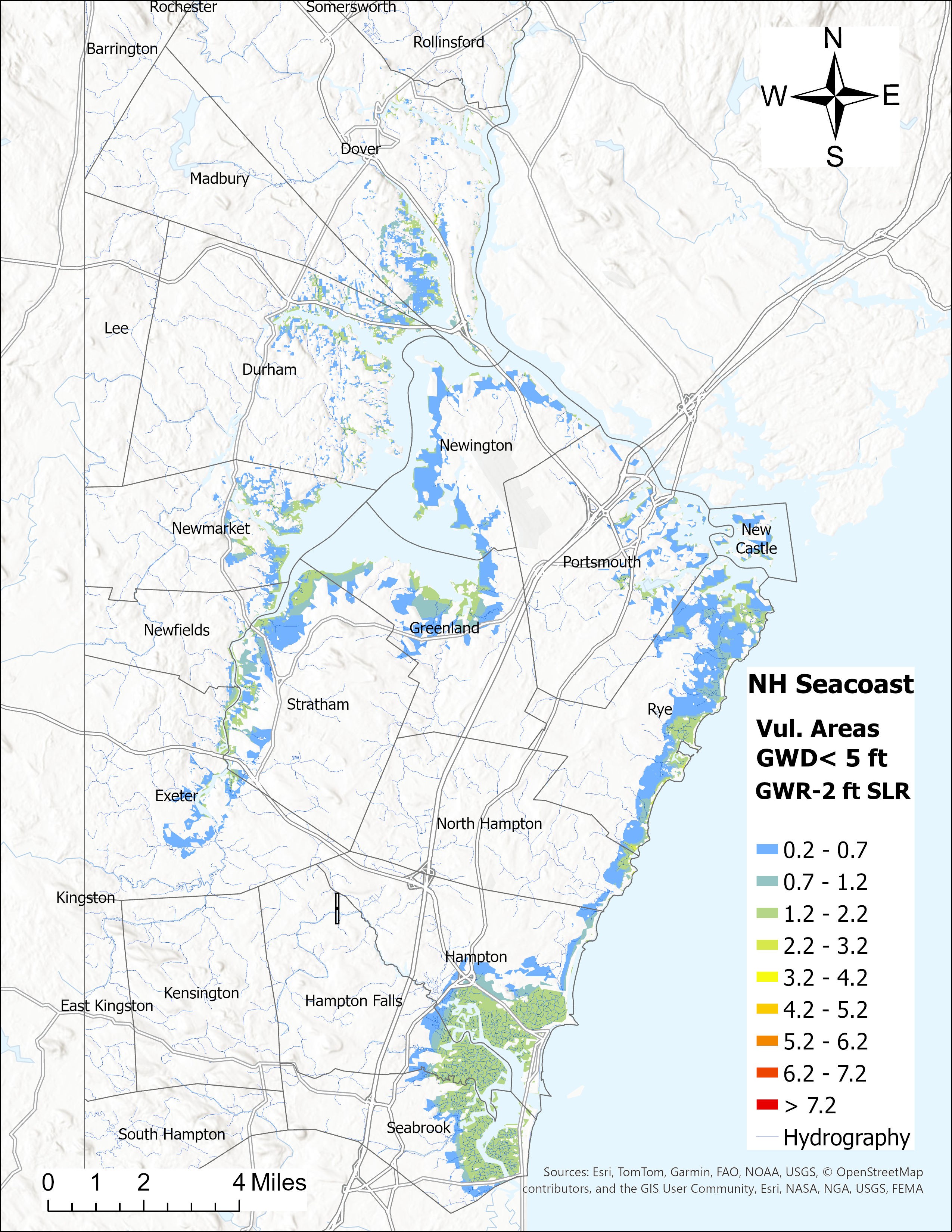 Description: Groundwater modeling was used to simulate the effects of sea-level rise on groundwater levels in the New Hampshire Seacoast. The MODFLOW-USG Transport model (Panday, 2022) was used to simulate groundwater flow and saltwater intrusion in these communities. This map shows vulnerable areas where the groundwater depth is currently less than 5 ft. The colors show the projected magnitude of groundwater rise under 2 ft of sea-level rise. Shallow and surface infrastructure, including pavements in these areas, is the most vulnerable to rising groundwater from sea-level rise and from heavy rainfall events.