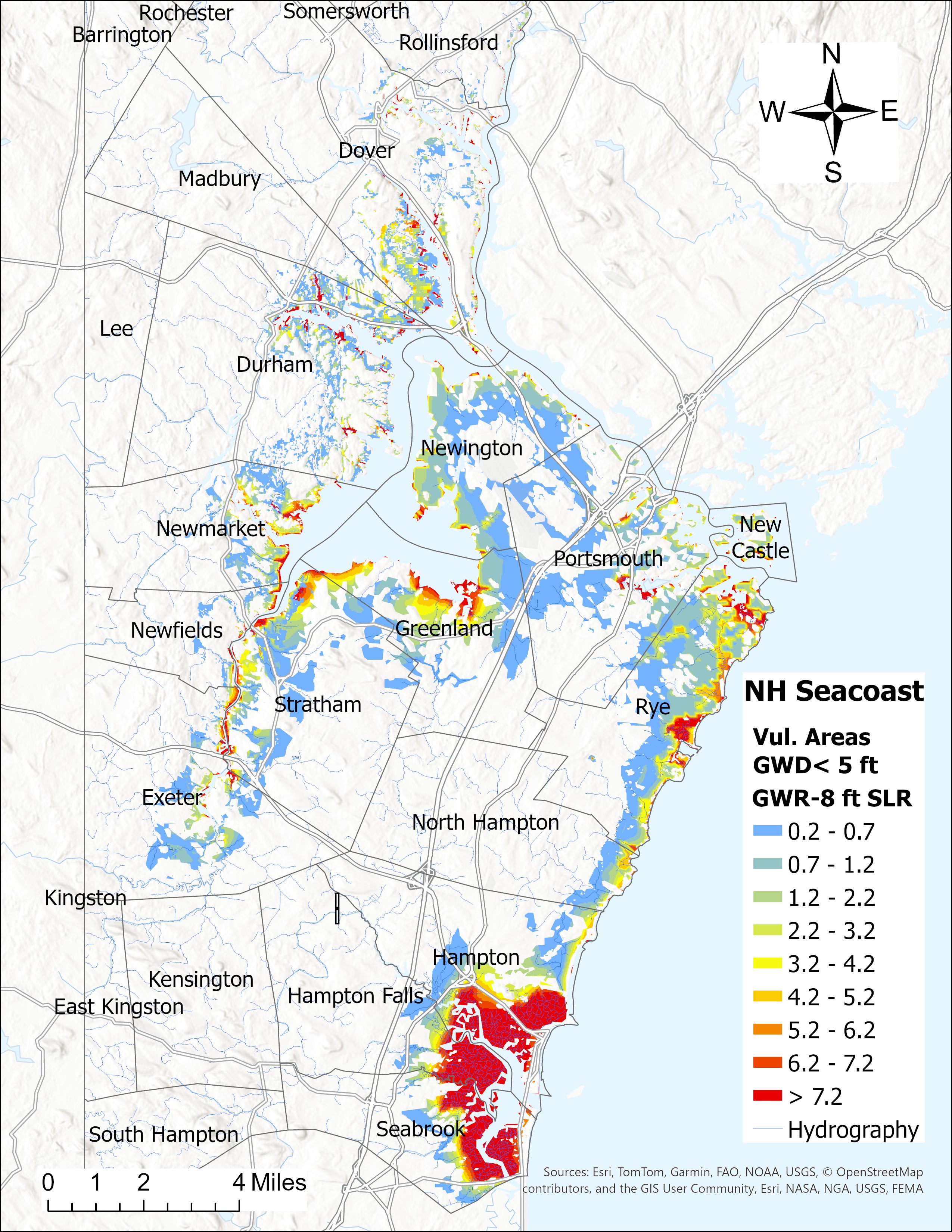 Description: Groundwater modeling was used to simulate the effects of sea-level rise on groundwater levels in the New Hampshire Seacoast. The MODFLOW-USG Transport model (Panday, 2022) was used to simulate groundwater flow and saltwater intrusion in these communities. This map shows vulnerable areas where the groundwater depth is currently less than 5 ft. The colors show the projected magnitude of groundwater rise under 8 ft of sea-level rise. Shallow and surface infrastructure, including pavements in these areas, is the most vulnerable to rising groundwater from sea-level rise and from heavy rainfall events.