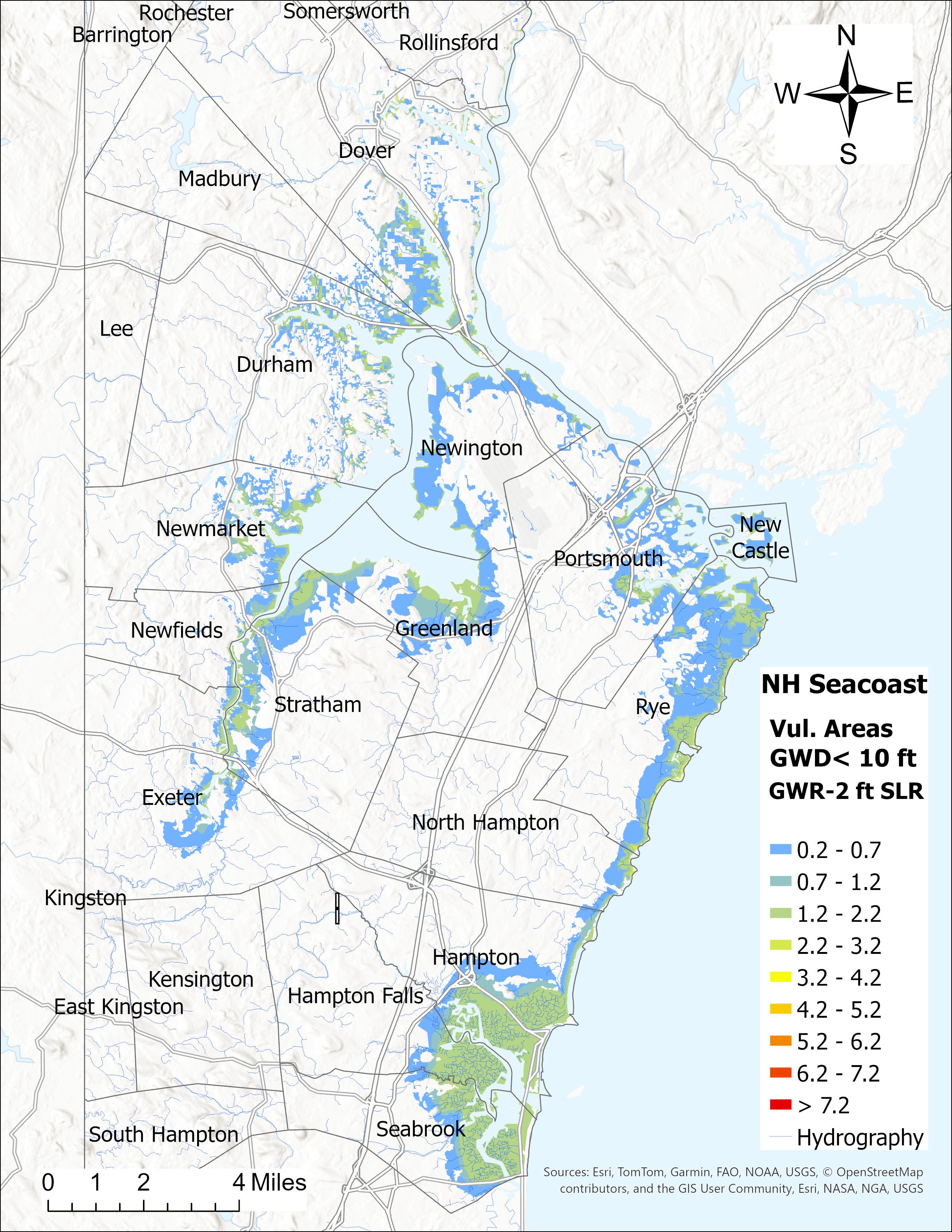 Description: Groundwater modeling was used to simulate the effects of sea-level rise on groundwater levels in the New Hampshire Seacoast. The MODFLOW-USG Transport model (Panday, 2022) was used to simulate groundwater flow and saltwater intrusion in these communities. This map shows vulnerable areas where the groundwater depth is currently less than 10 ft. The colors show the projected magnitude of groundwater rise under 2 ft of sea-level rise. Subsurface infrastructure assets, including utilities, are the most vulnerable to rising groundwater from sea-level rise and heavy rainfall events in these areas.
