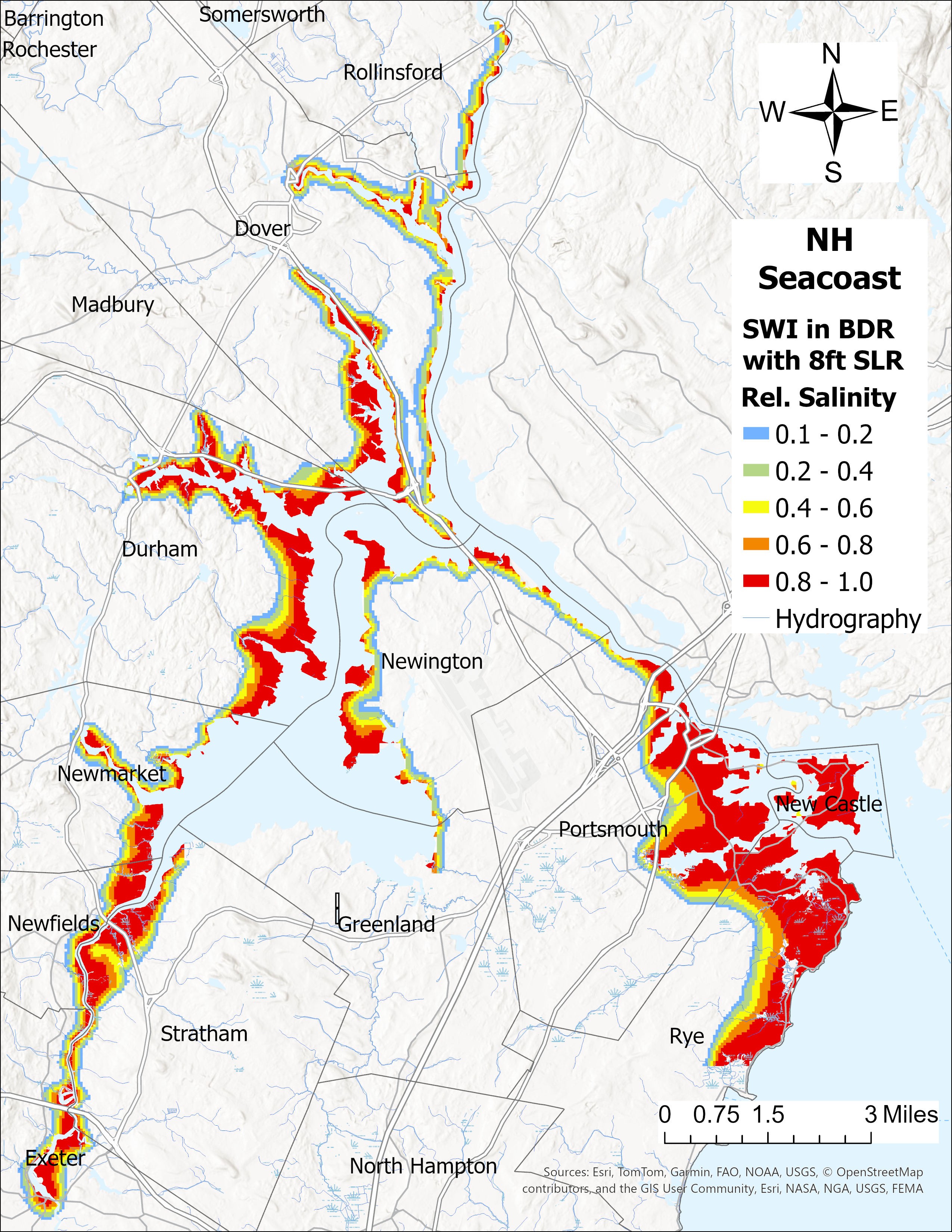 Description: Groundwater modeling was used to simulate the effects of sea-level rise on groundwater levels in the New Hampshire Seacoast. The MODFLOW-USG Transport model (Panday, 2022) was used to simulate groundwater flow and saltwater intrusion in these communities. This map shows relative salinity (0=freshwater-blue,1=saltwater-red). SWI was simulated for Rollinsford, Dover, Madbury, Durham, Newmarket, Newfields, Exeter, Newington, Portsmouth, New Castle, and parts of Rye and Stratham. SWI was not simulated in the southern portion of the NH Seacoast, including parts of Rye and Stratham, Greenland, North Hampton, Hampton, Hampton Falls, and Seabrook. The SWI modeling produced estimates of relative salinity in groundwater at various depths ranging from approximately 10 feet to more than 800 feet. This map shows SWI in bedrock approximately 800 feet below MSL with 8 feet of SLR. There is substantial uncertainty in these estimates due to limited knowledge of bedrock fracturing and other subsurface parameters. These model results and maps provide a first-cut estimate of saltwater intrusion and should be enhanced and/or verified by field measurements.